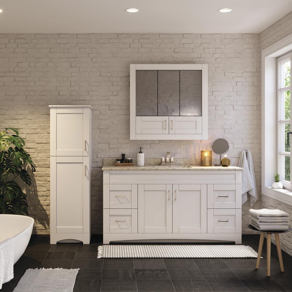 The Brighton Collection offers transitional styling with multiple vanity sizes and accessories to accommodate your unique storage needs. The Brighton features a trendy shaker door and drawer profile in a dark chocolate or matte white finish. Soft close door hinges and drawer slides are included, providing smooth and quiet use. Complete the look with matching linen and medicine cabinets.