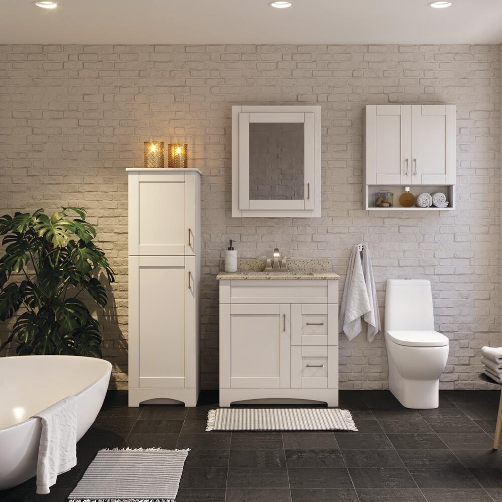 The Brighton Collection offers transitional styling with multiple vanity sizes and accessories to accommodate your unique storage needs. The Brighton features a trendy shaker door and drawer profile in a or finish. Soft-close door hinges and drawer slides are included, providing smooth and quiet use. Complete the look with matching linen and medicine cabinets.
