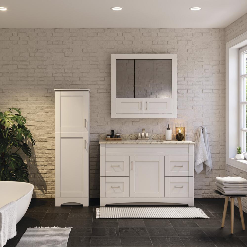 The Brighton Collection offers transitional styling with multiple vanity sizes and accessories to accommodate your unique storage needs. The Brighton features a trendy shaker door and drawer profile in a or finish. Soft-close door hinges and drawer slides are included, providing smooth and quiet use. Complete the look with matching linen and medicine cabinets.