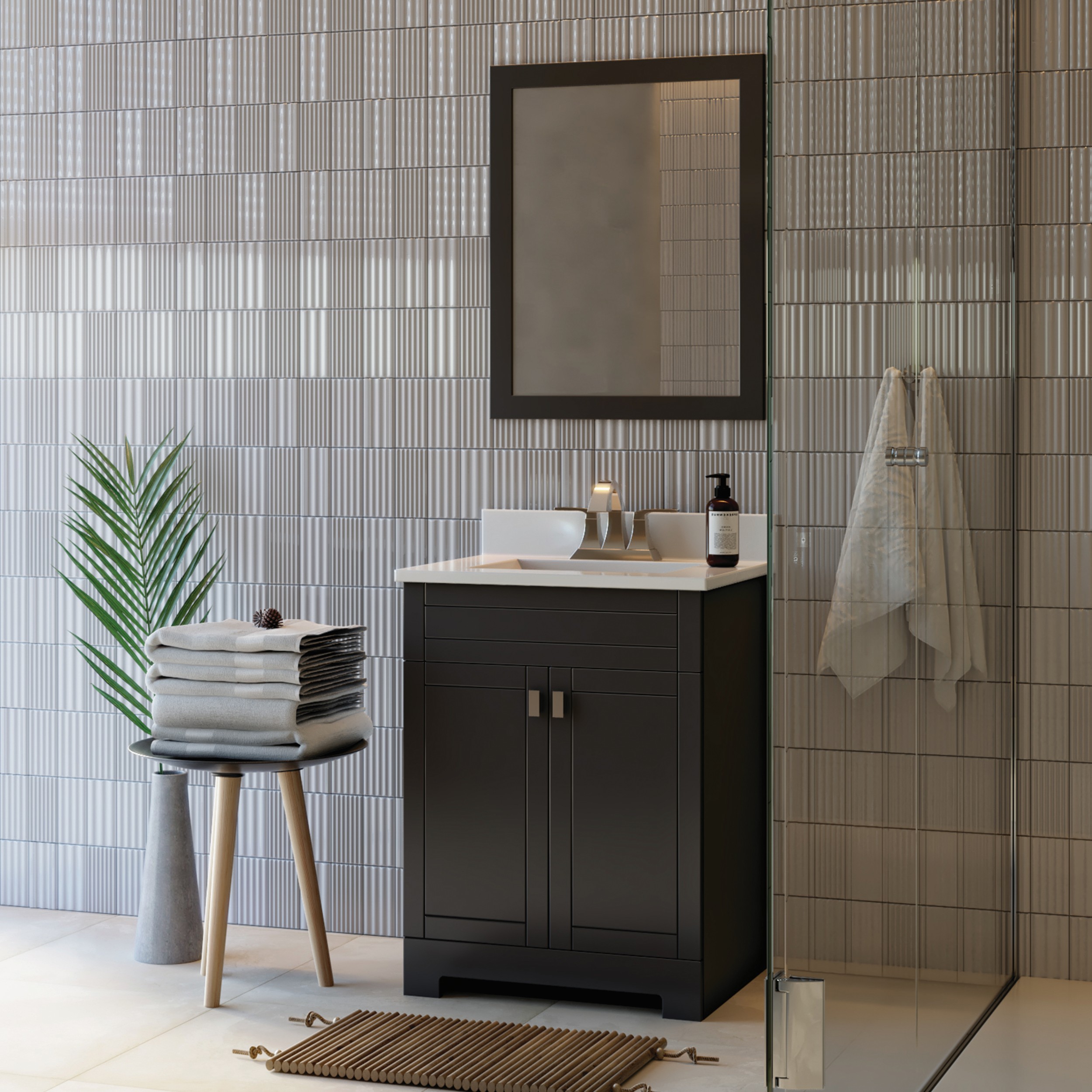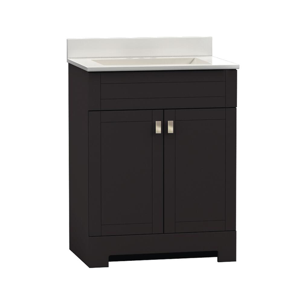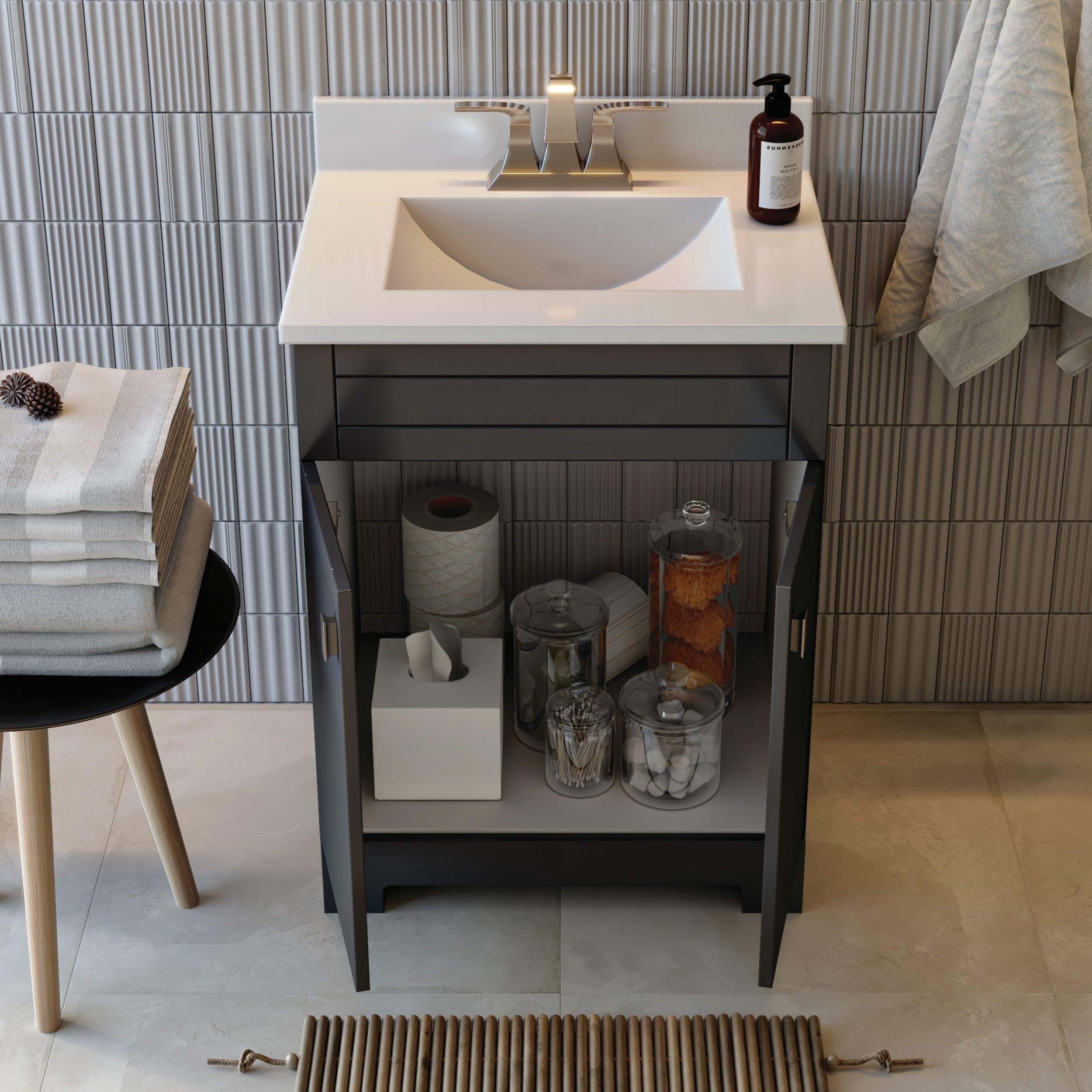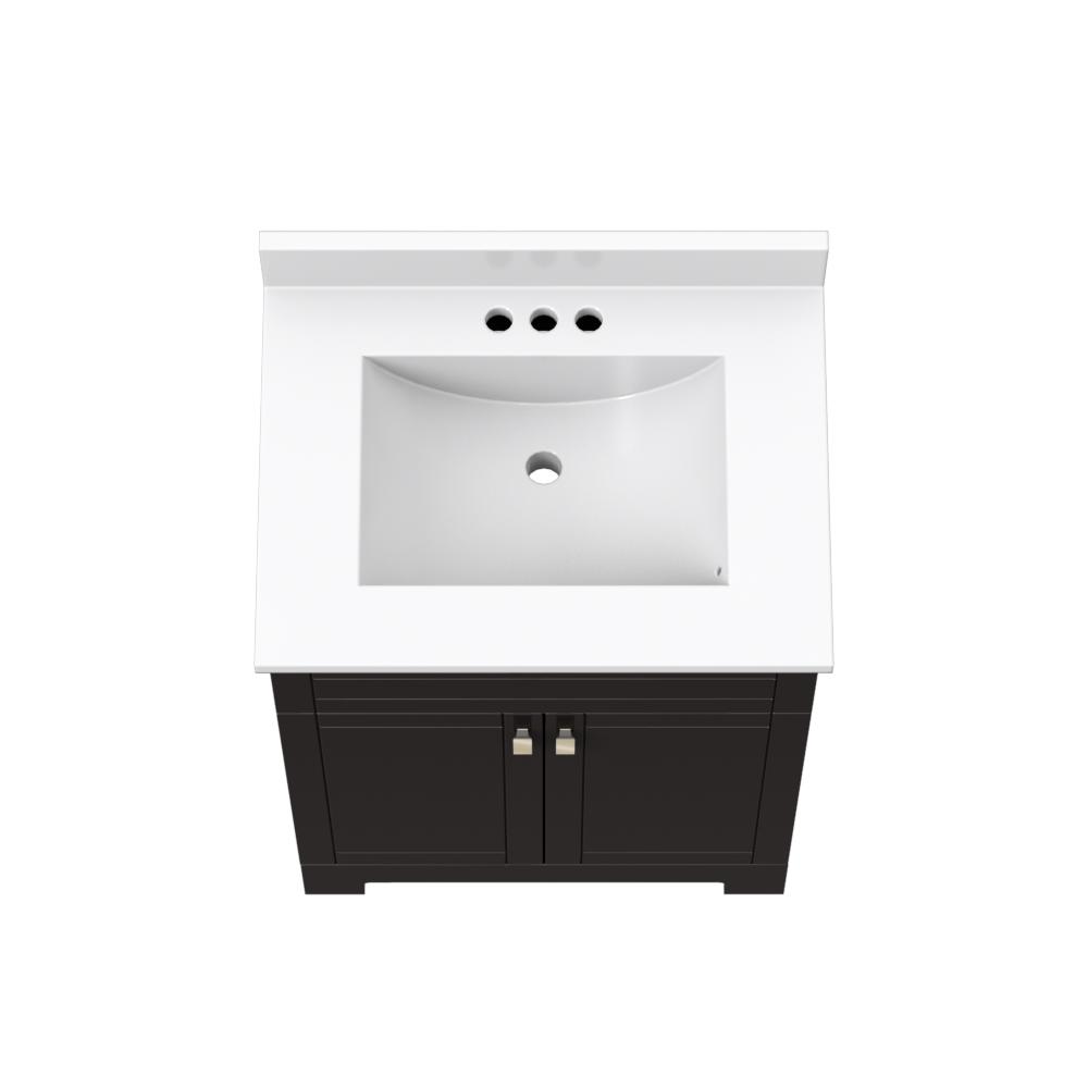 The Essex Collection offers transitional styling in multiple sizes and finishes to suit your unique taste and storage needs. Each vanity is available in dark chocolate, matte white and gray finishes with contemporary brushed nickel hardware and soft close features. A white cultured marble vanity top, set for a 4 inch on-center faucet is included (faucet sold separately). The 1-piece vanity top features an easy to clean integrated wave bowl and backsplash.