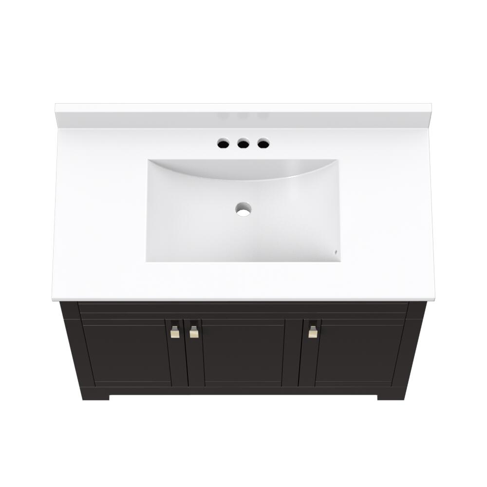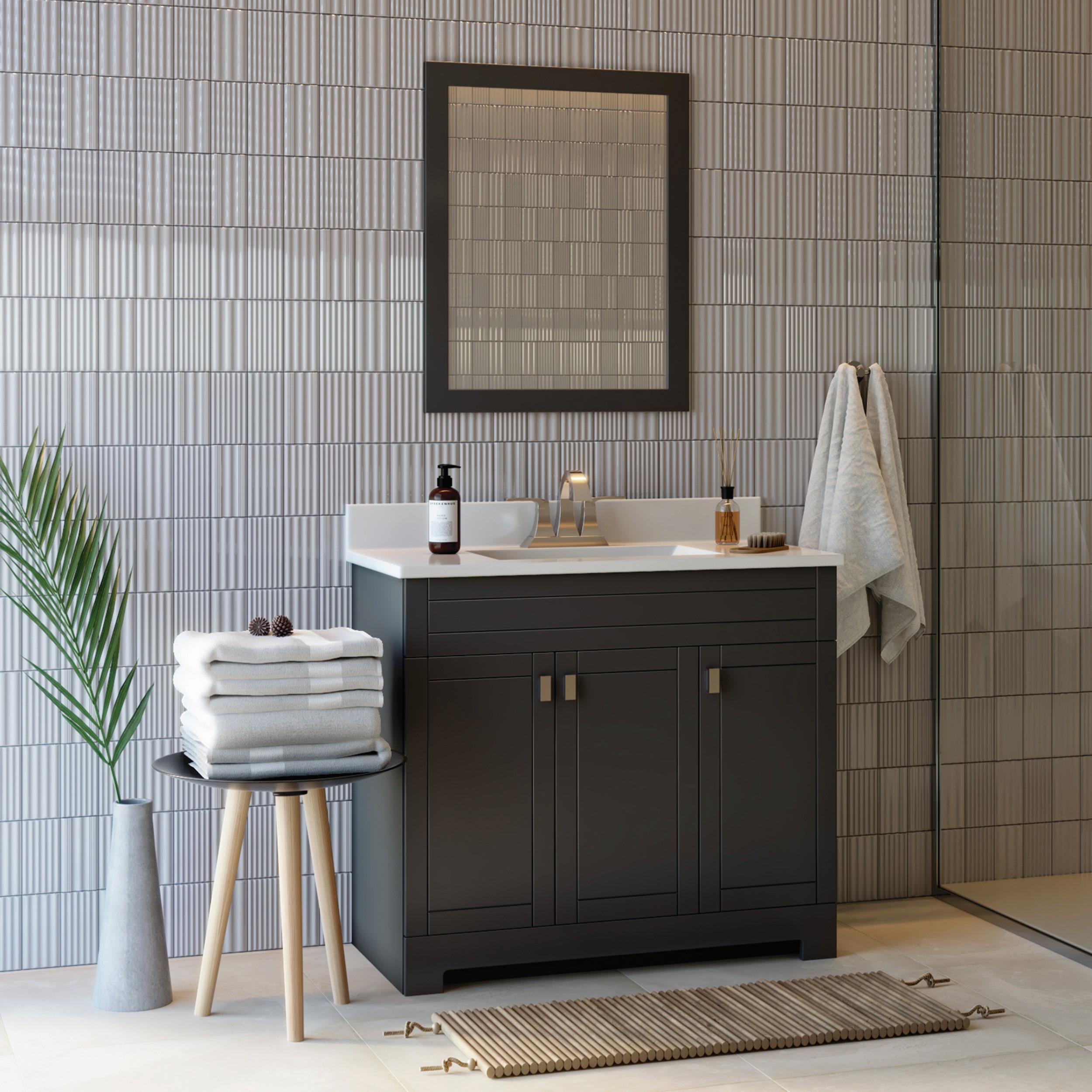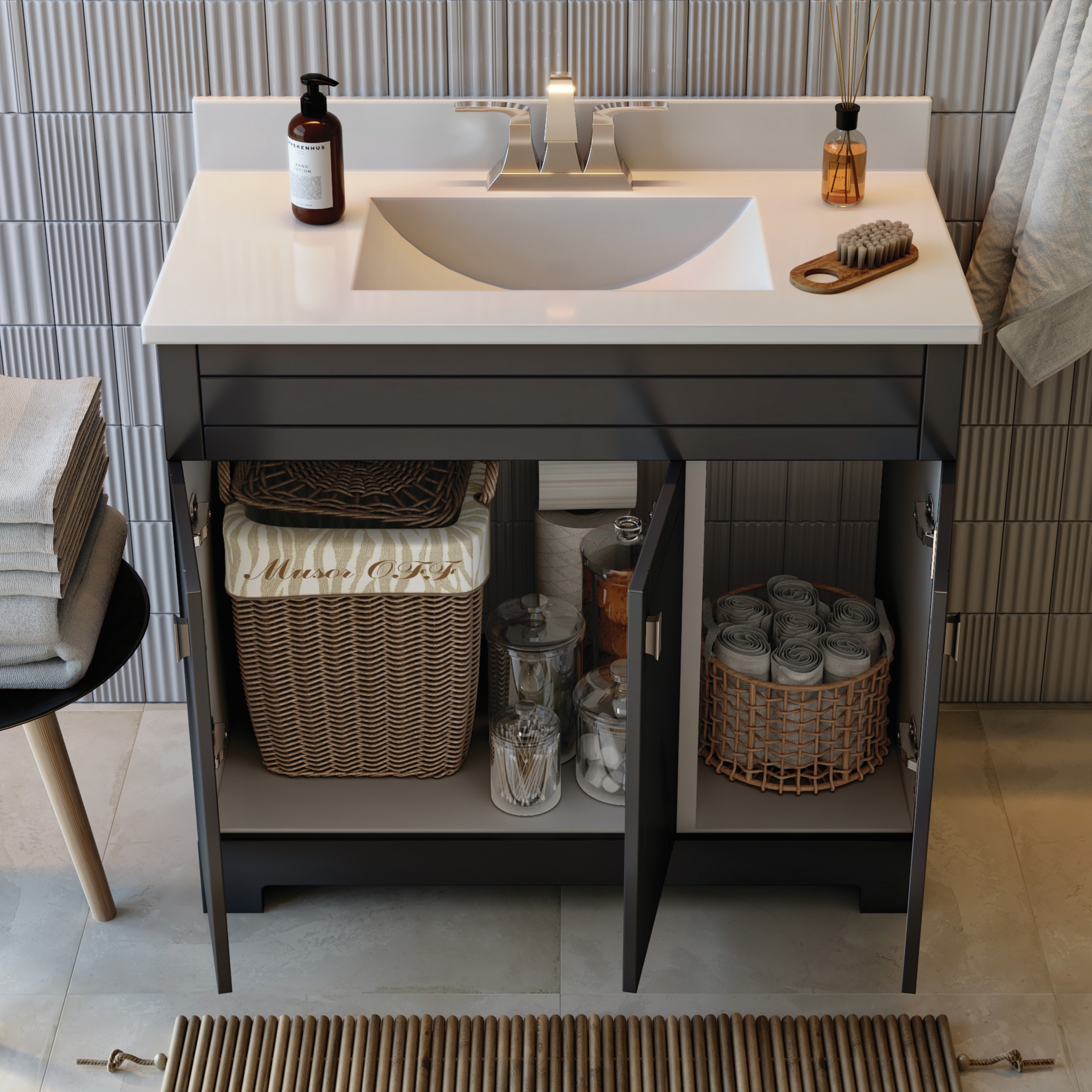 The Essex Collection offers transitional styling in multiple sizes and finishes to suit your unique taste and storage needs. Each vanity is available in dark chocolate, matte white, and gray finishes with contemporary brushed nickel hardware and soft close features. A white cultured marble vanity top, set for a 4-inch on-center faucet, is included (faucet sold separately). The one-piece vanity top features an easy-to-clean integrated wave bowl and backsplash.