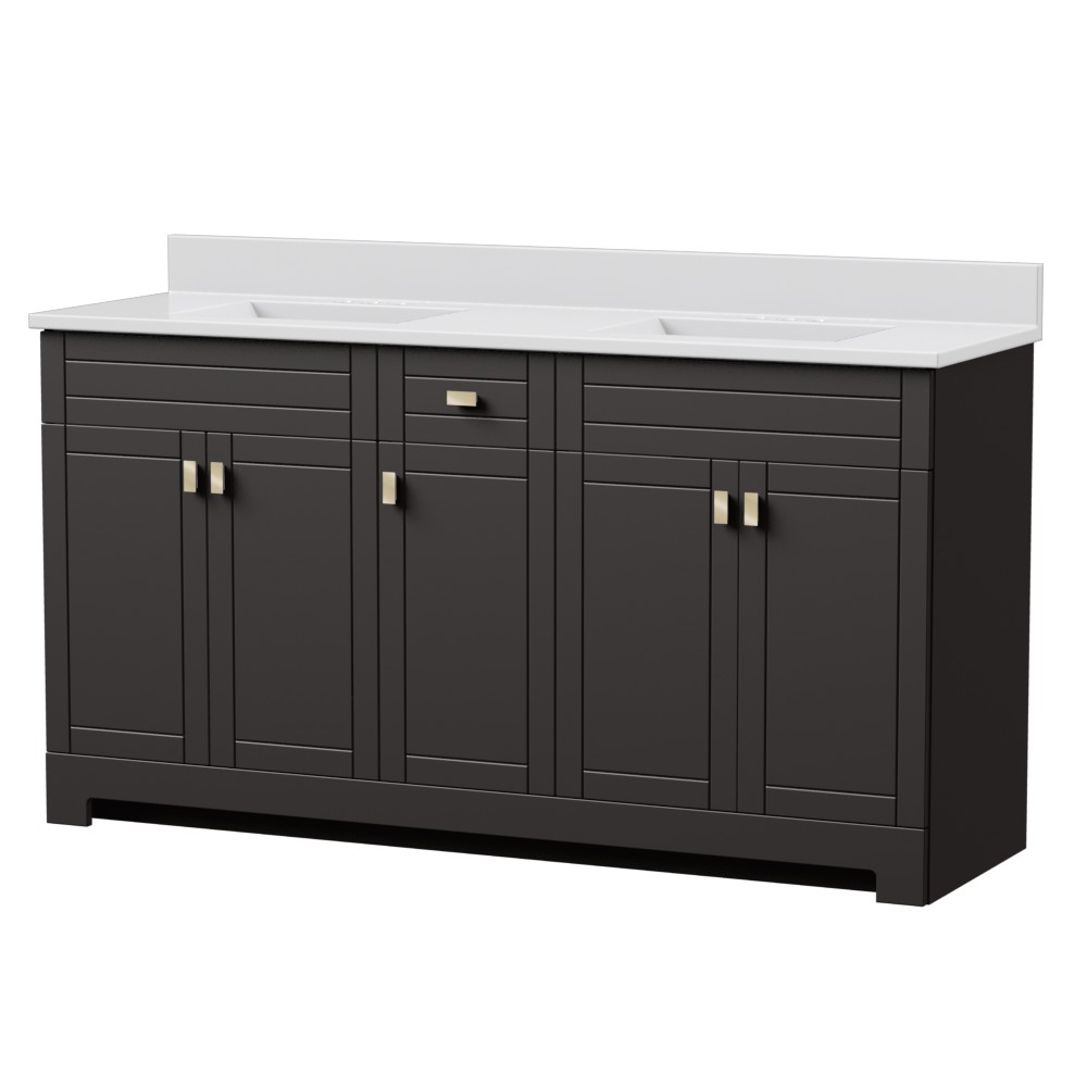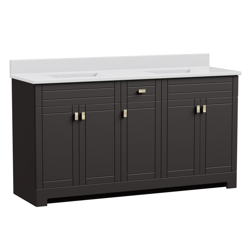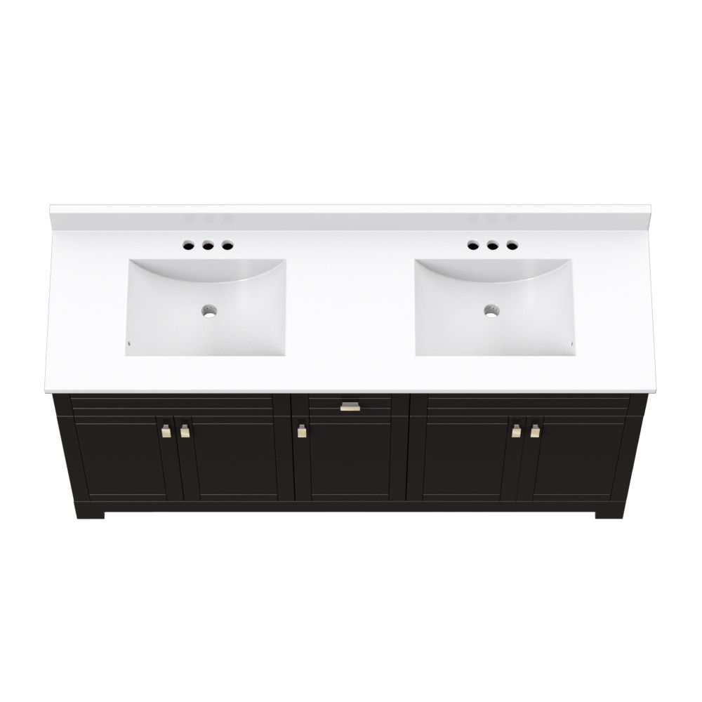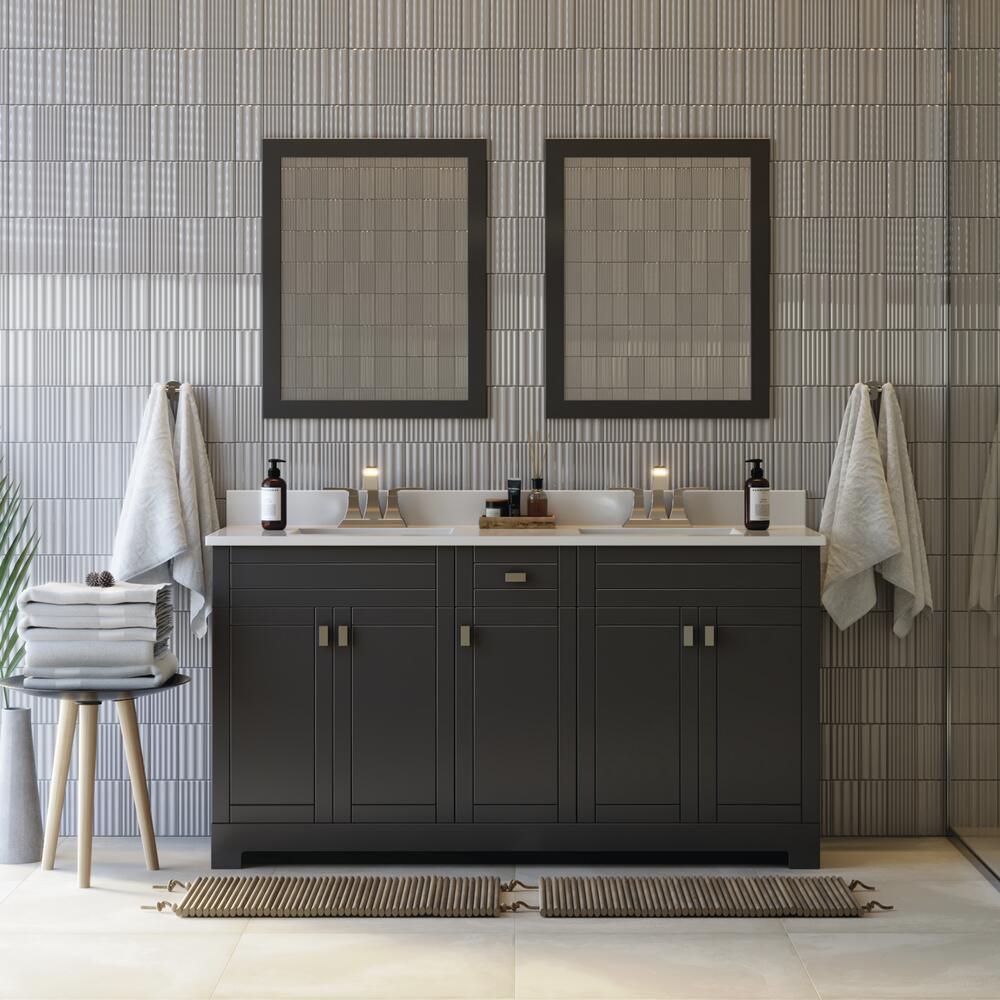 The Essex Collection offers transitional styling in multiple sizes and finishes to suit your unique taste and storage needs. Each vanity is available in dark chocolate, matte white, and gray finishes with contemporary brushed nickel hardware and soft close features. A white cultured marble vanity top, set for two 4-inch faucets, is included (faucets sold separately). The one-piece vanity top features two easy-to-clean integrated wave bowls and backsplash.