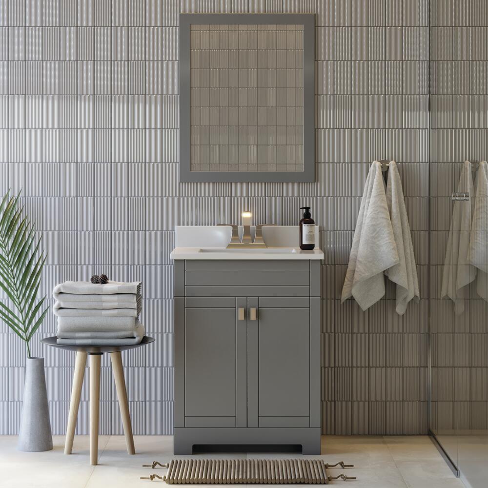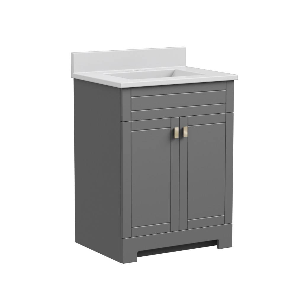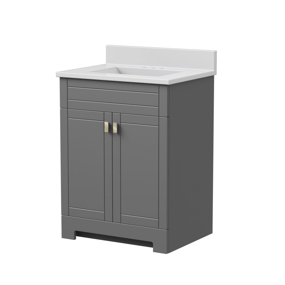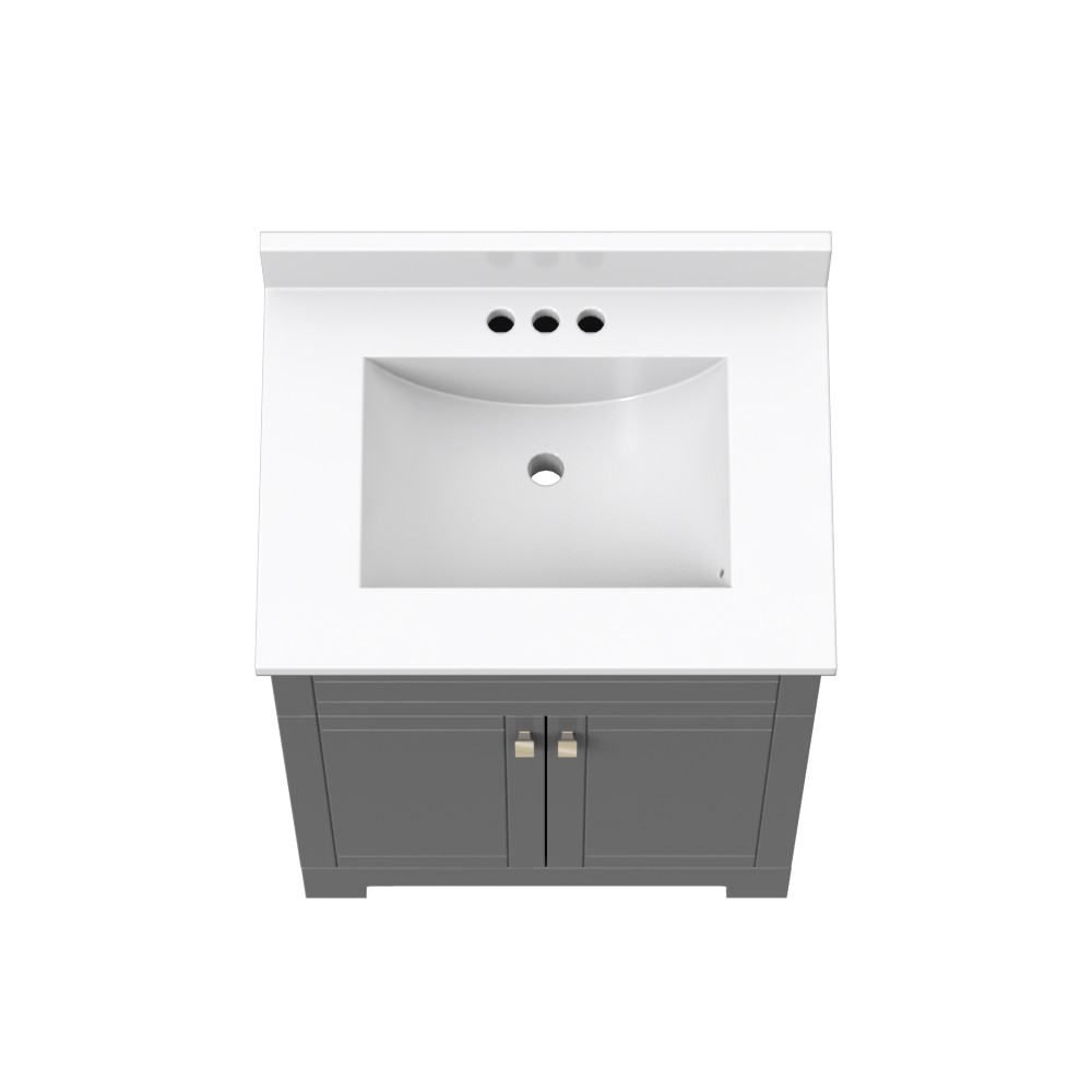 The Essex Collection offers transitional styling in multiple sizes and finishes to suit your unique taste and storage needs. Each vanity is available in dark chocolate, matte white, and gray finishes with contemporary brushed nickel hardware and soft close features. A white cultured marble vanity top, set for a 4-inch on-center faucet is included (faucet sold separately). The one-piece vanity top features an easy-to-clean integrated wave bowl and backsplash.