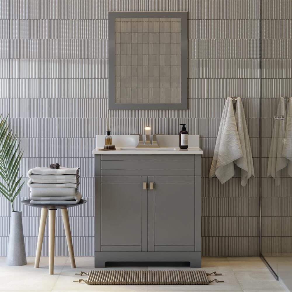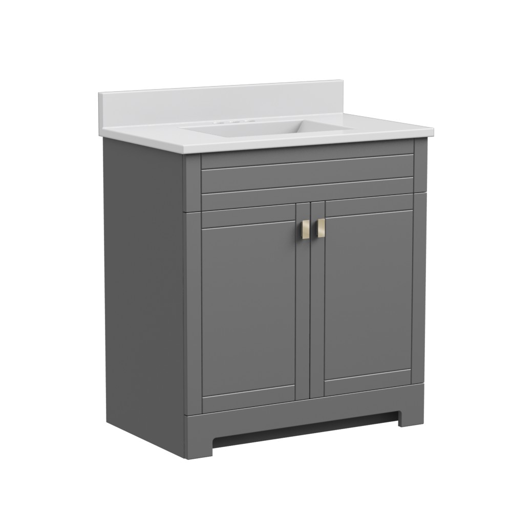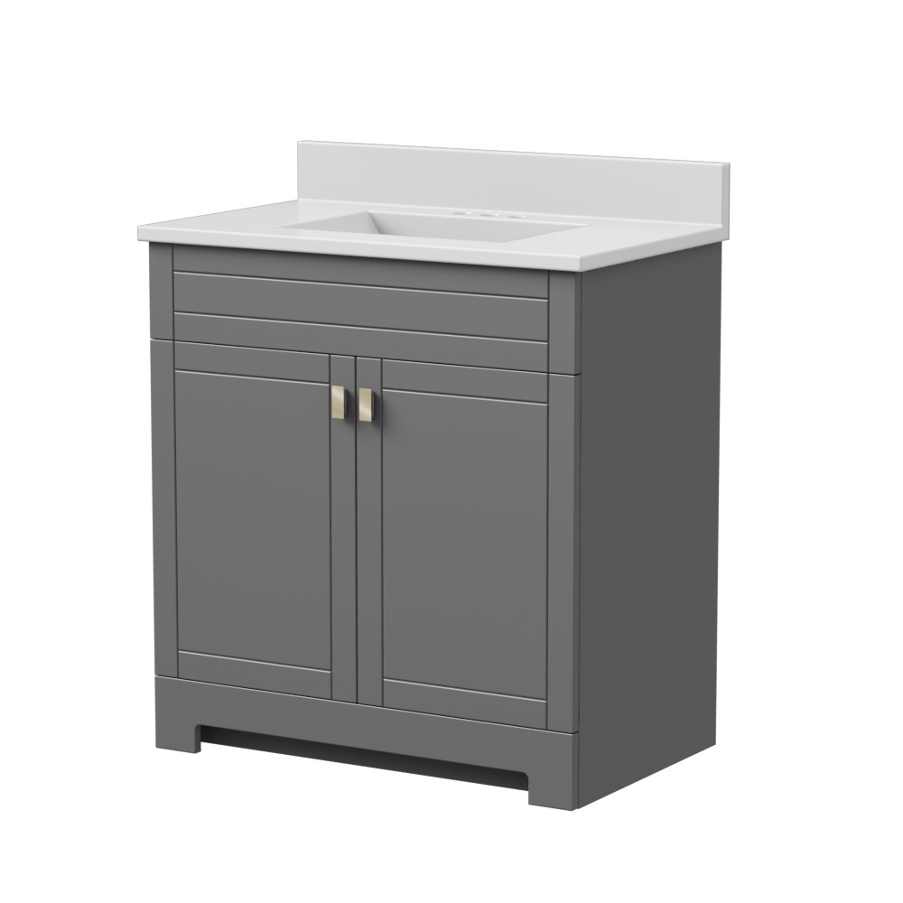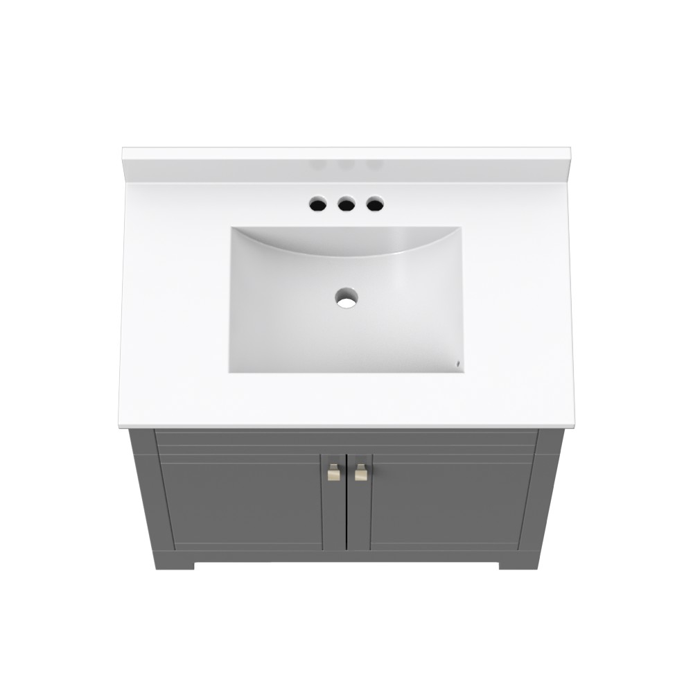 The Essex Collection offers transitional styling in multiple sizes and finishes to suit your unique taste and storage needs. Each vanity is available in dark chocolate, matte white, and gray finishes with contemporary brushed nickel hardware and soft close features. A white cultured marble vanity top, set for a 4-inch on-center faucet, is included (faucet sold separately). The one-piece vanity top features an easy-to-clean integrated wave bowl and backsplash.