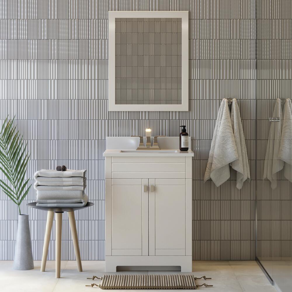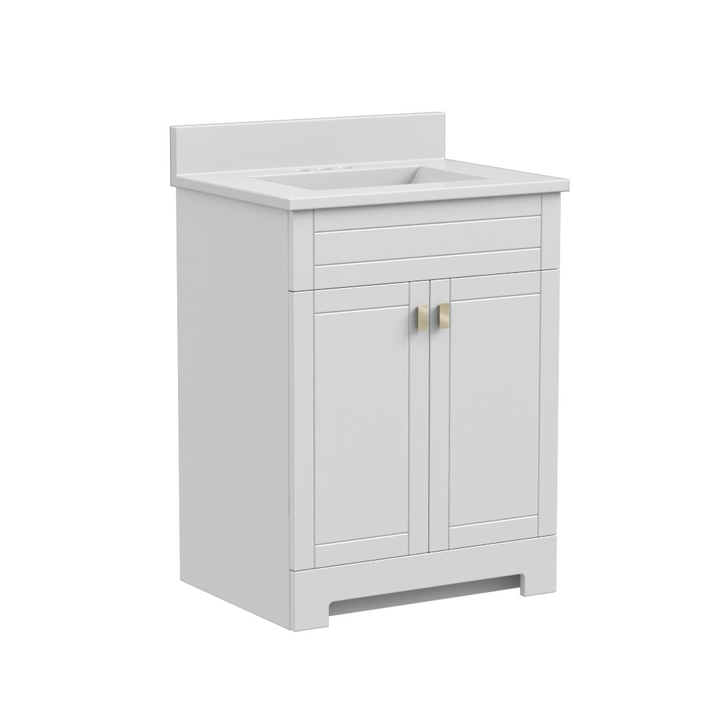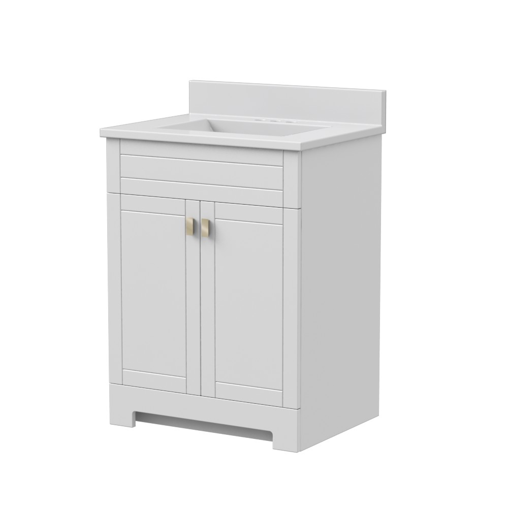 The Essex Collection offers transitional styling in multiple sizes and finishes to suit your unique taste and storage needs. Each vanity is available in dark chocolate, matte white, and gray finishes with contemporary brushed nickel hardware and soft close features. A white cultured marble vanity top, set for a 4-inch on-center faucet, is included (faucet sold separately). The one-piece vanity top features an easy-to-clean integrated wave bowl and backsplash.