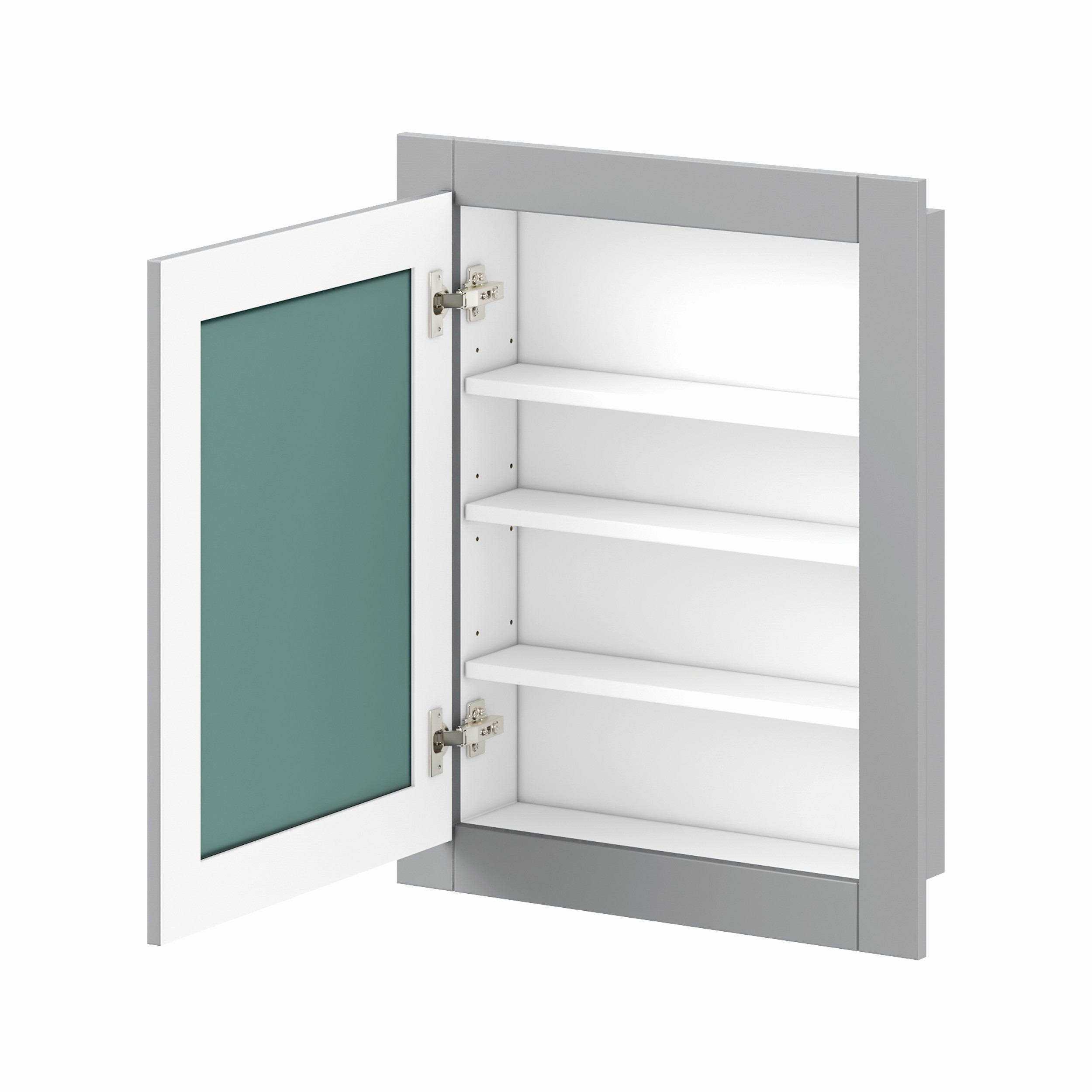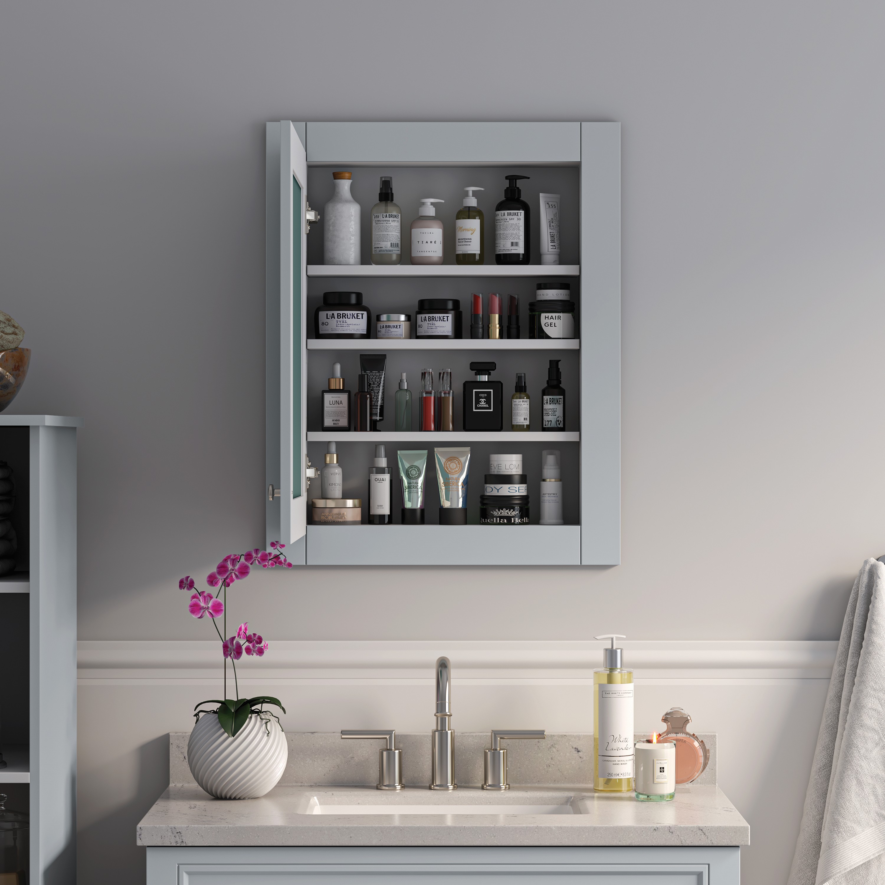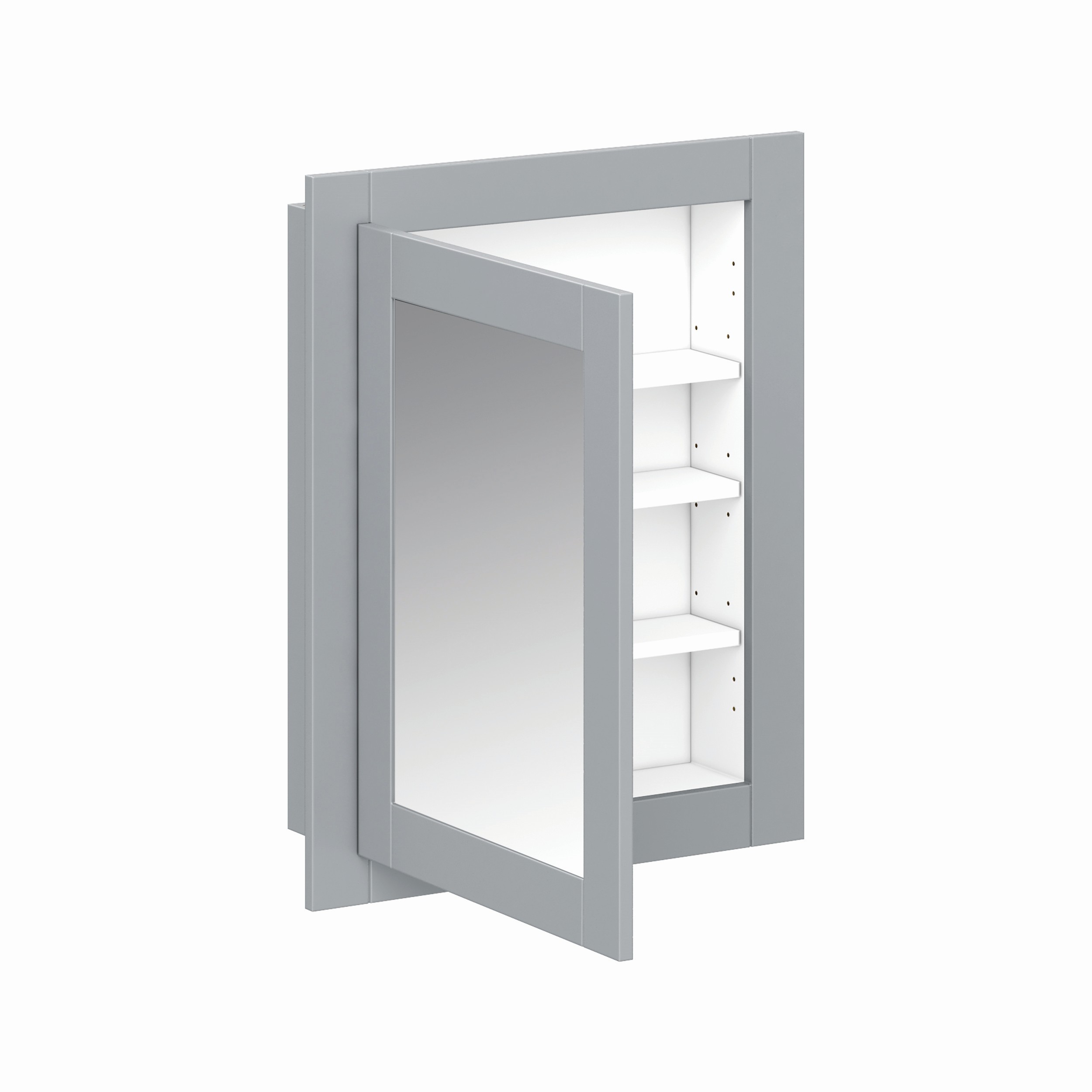 Refresh your bathroom with the transitional Sheffield medicine cabinet, featuring a single frame soft-close mirror door. Available in a painted Cloud Gray finish, it offers three inner shelves that provide ample storage for your essentials. This versatile cabinet can be installed either surface-mounted or recessed into your wall.