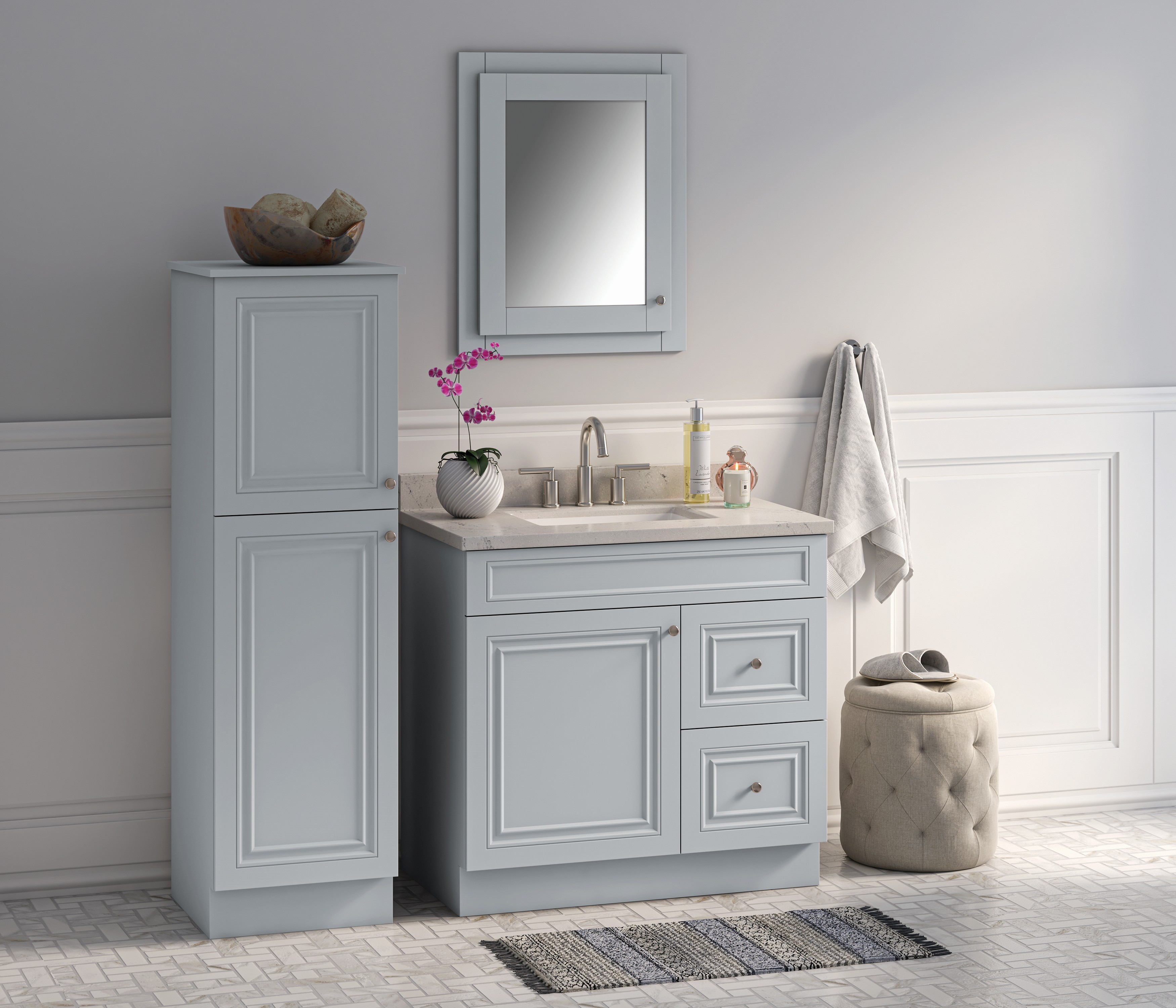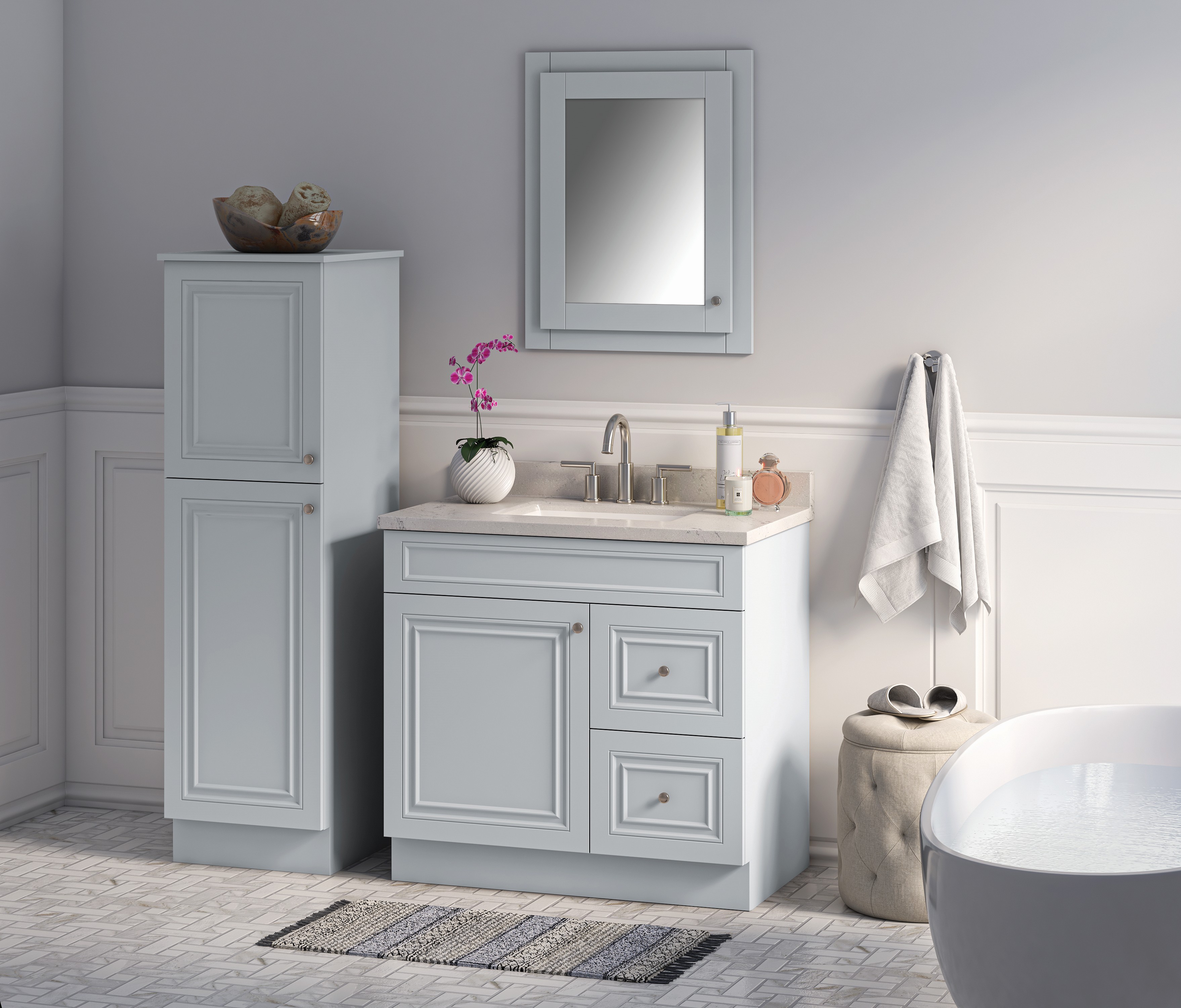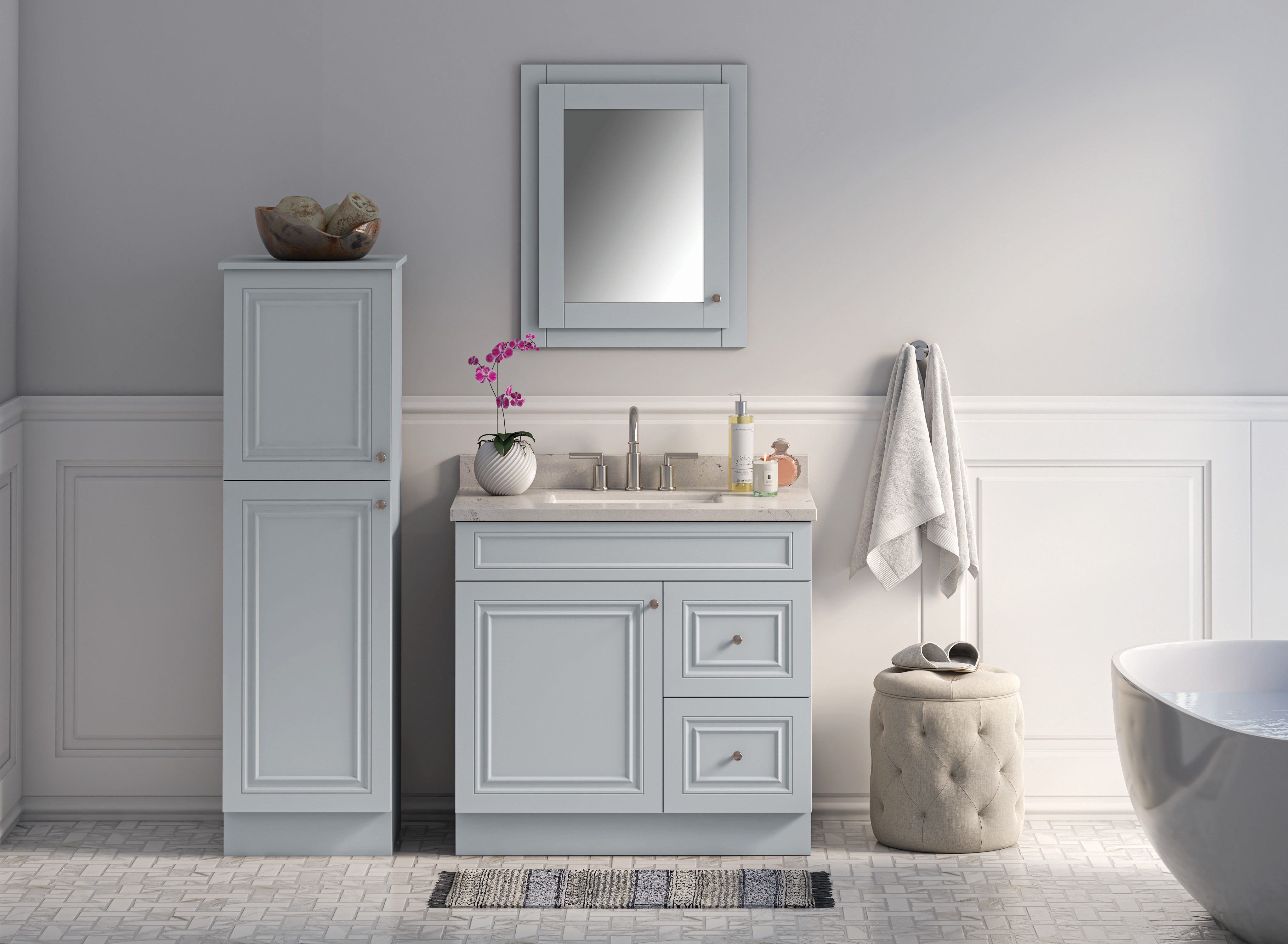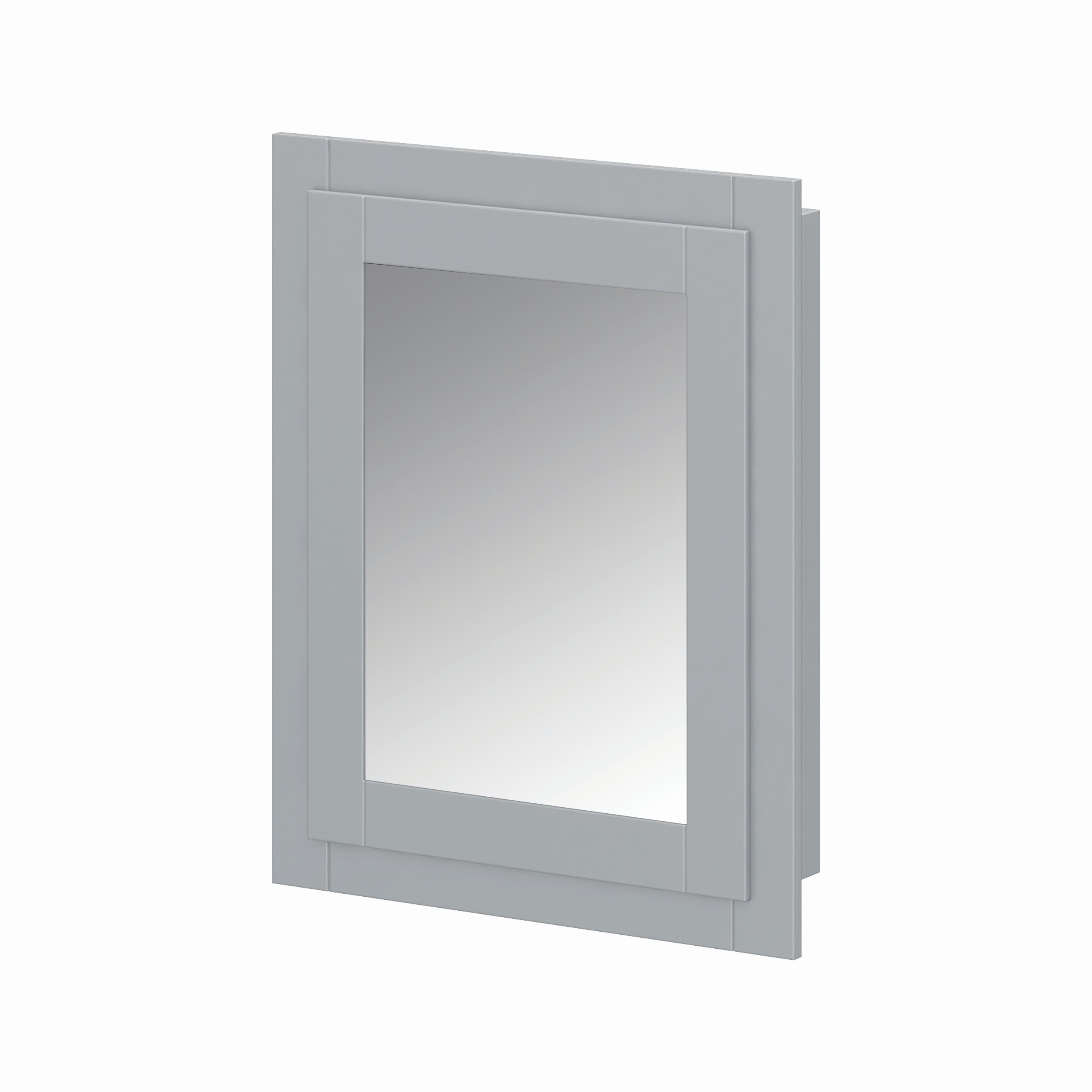 Refresh your bathroom with the transitional Sheffield medicine cabinet, featuring a single frame soft-close mirror door. Available in a painted Cloud Gray finish, it offers three inner shelves that provide ample storage for your essentials. This versatile cabinet can be installed either surface-mounted or recessed into your wall.