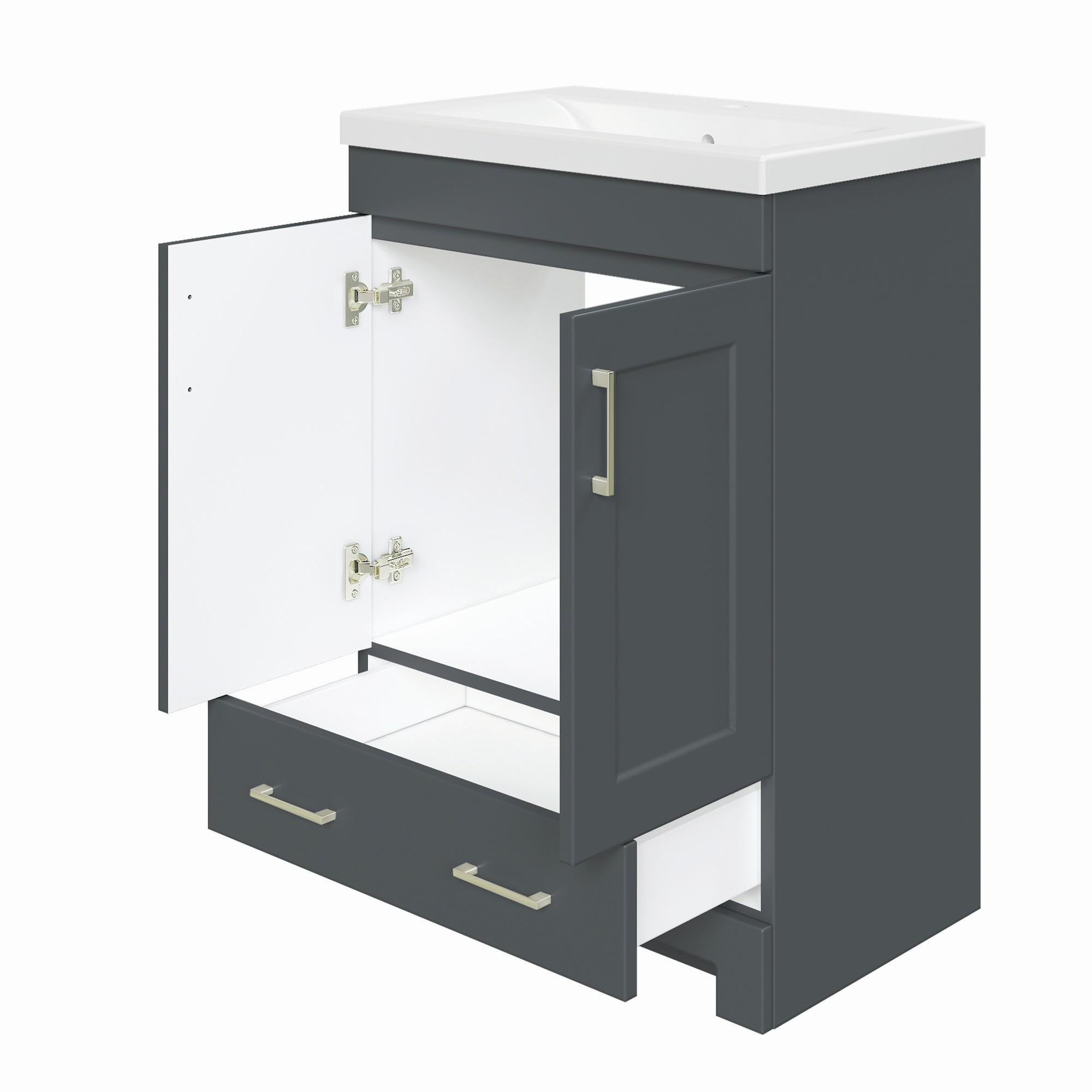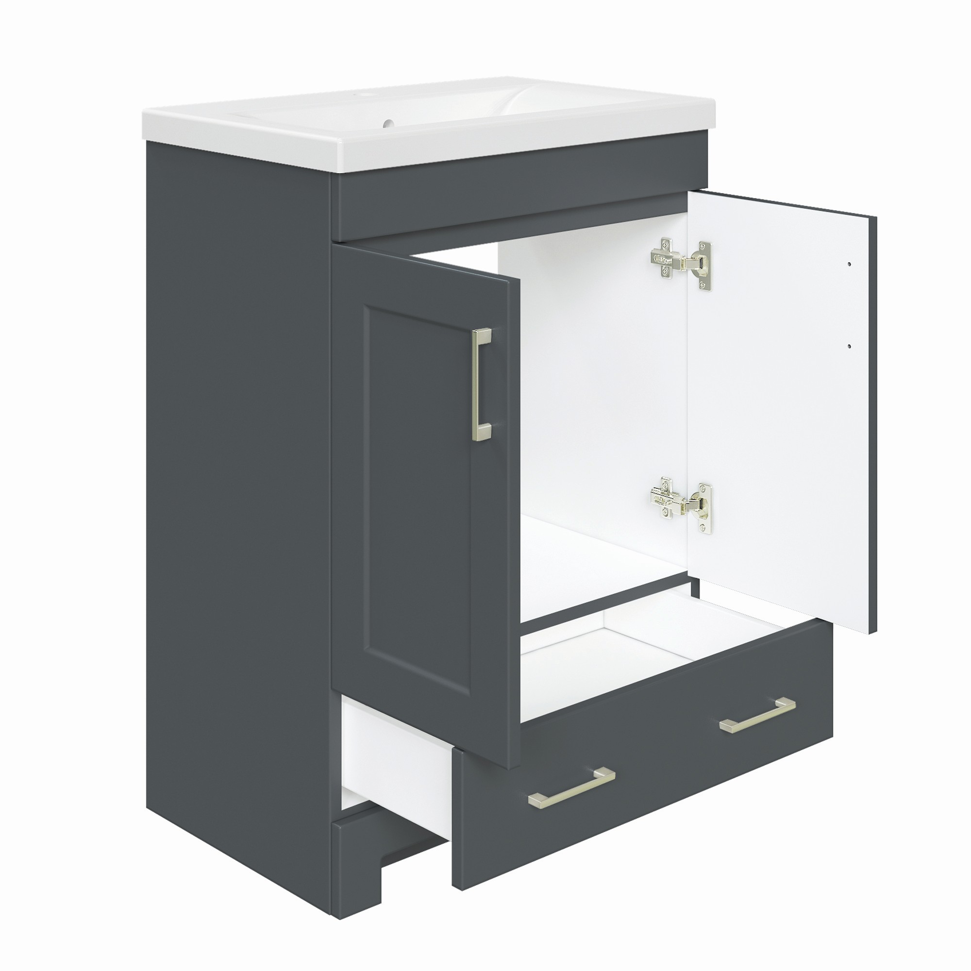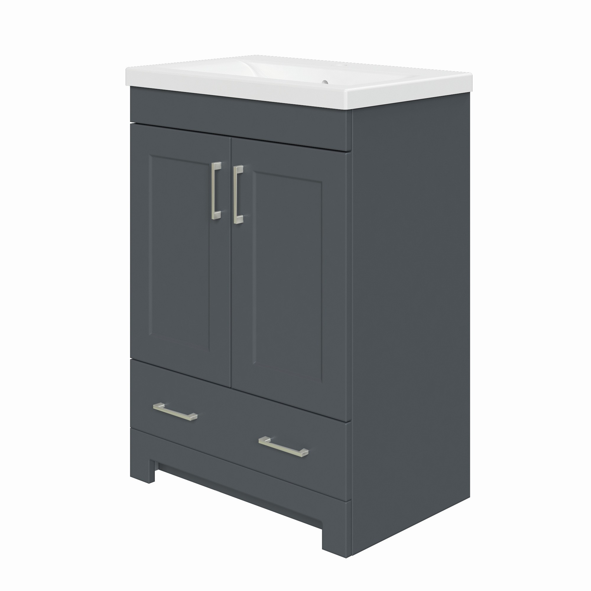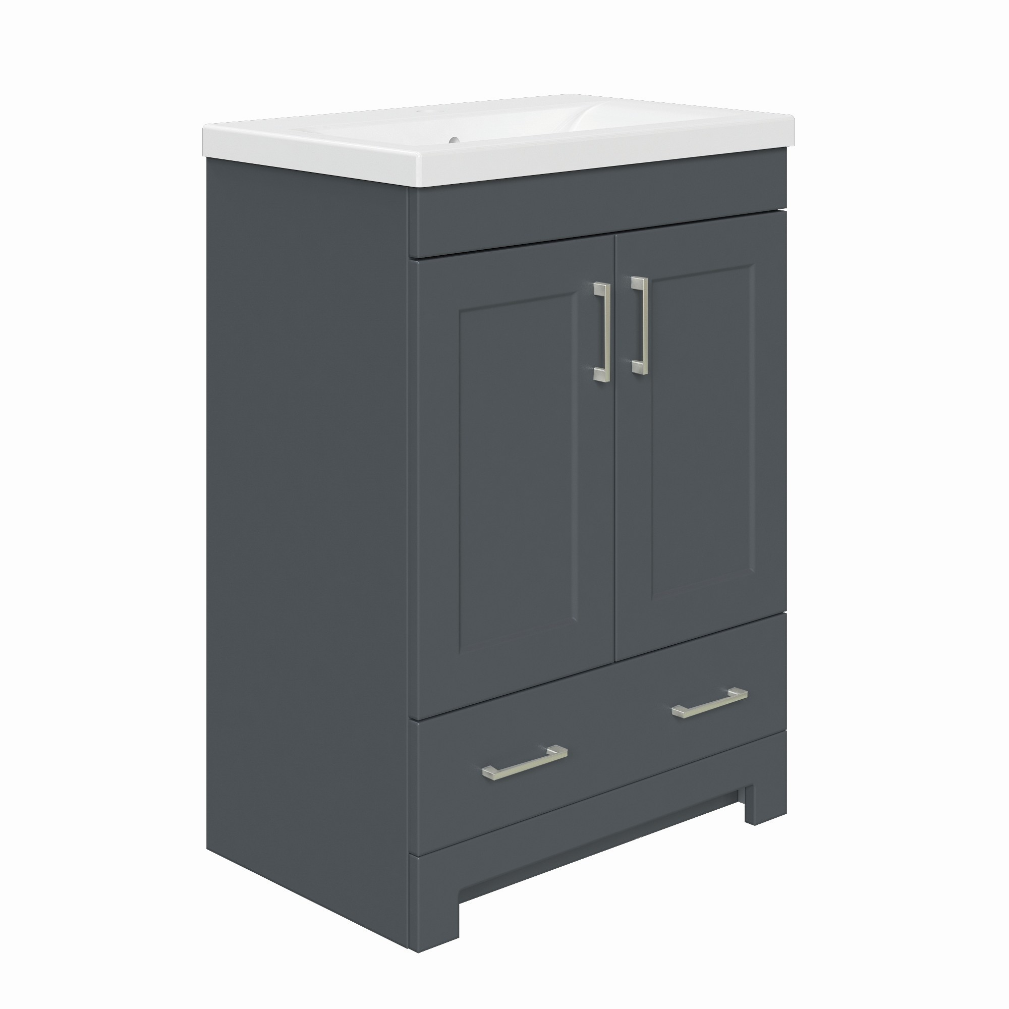 The MagickWoods Staverton collection offers a space-saving design which is ideal for smaller sized bath and powder rooms. Staverton is available in 3 beautiful and popular finishes (White, Espresso Bean and Steel Gray) to coordinate with multiple decors. Each finish is complimented with contemporary cabinet handles in a brushed nickel finish. Each 24-inch wide vanity features 2 doors and 1 drawer, and 30-inch wide and 36-inch wide vanities feature 2 doors and 2 drawers to your keep toiletries tidy. Staverton’s soft-closing doors and drawers eliminate slamming, creating quiet peaceful mornings. The simple-designed Staverton mirror hangs vertically or horizontally and is a perfect addition to any room in your home. Each Staverton vanity base includes a white ceramic vanity top with integrated rectangular bowl, drilled for a single-hole faucet (faucets are sold separately). Complete the look: the Staverton linen cabinet offers concealed storage, plus an open shelf to hold linens, baskets and favorite toiletries. Staverton vanities, mirrors and linen cabinets are conveniently pre-assembled and easy to install.