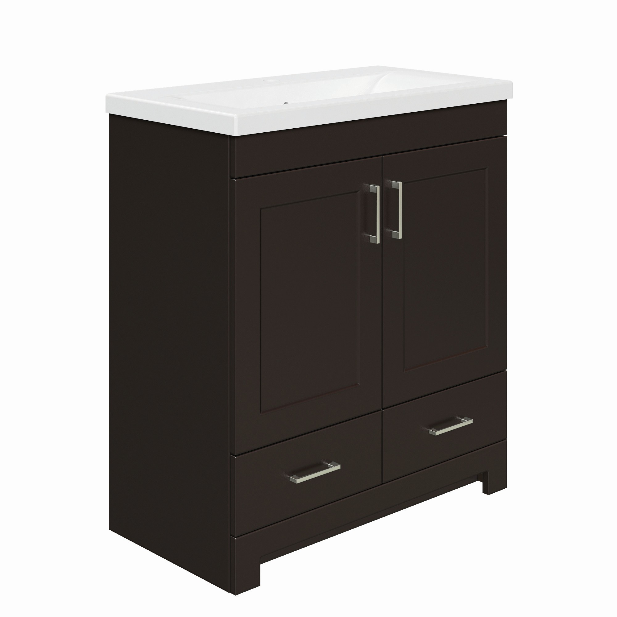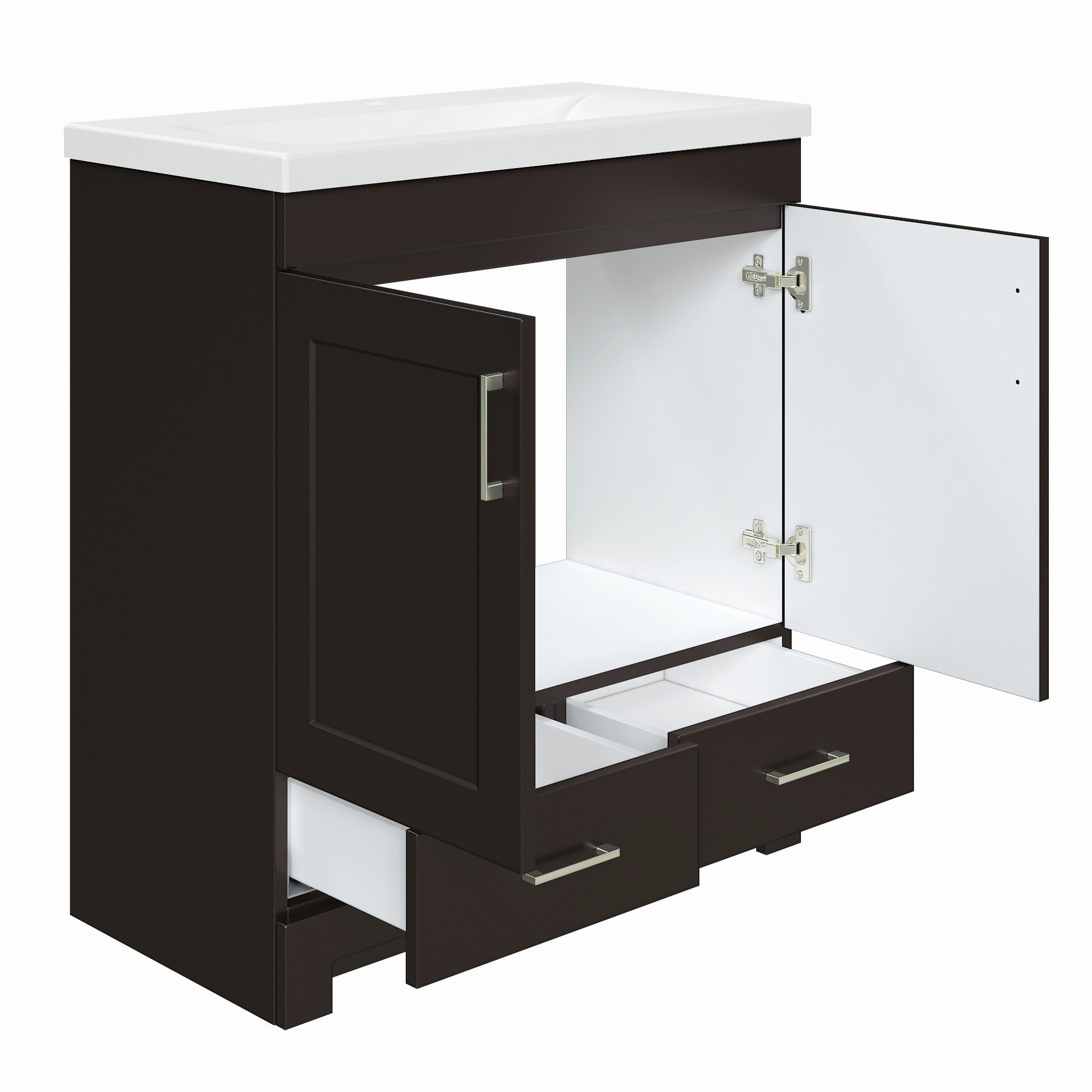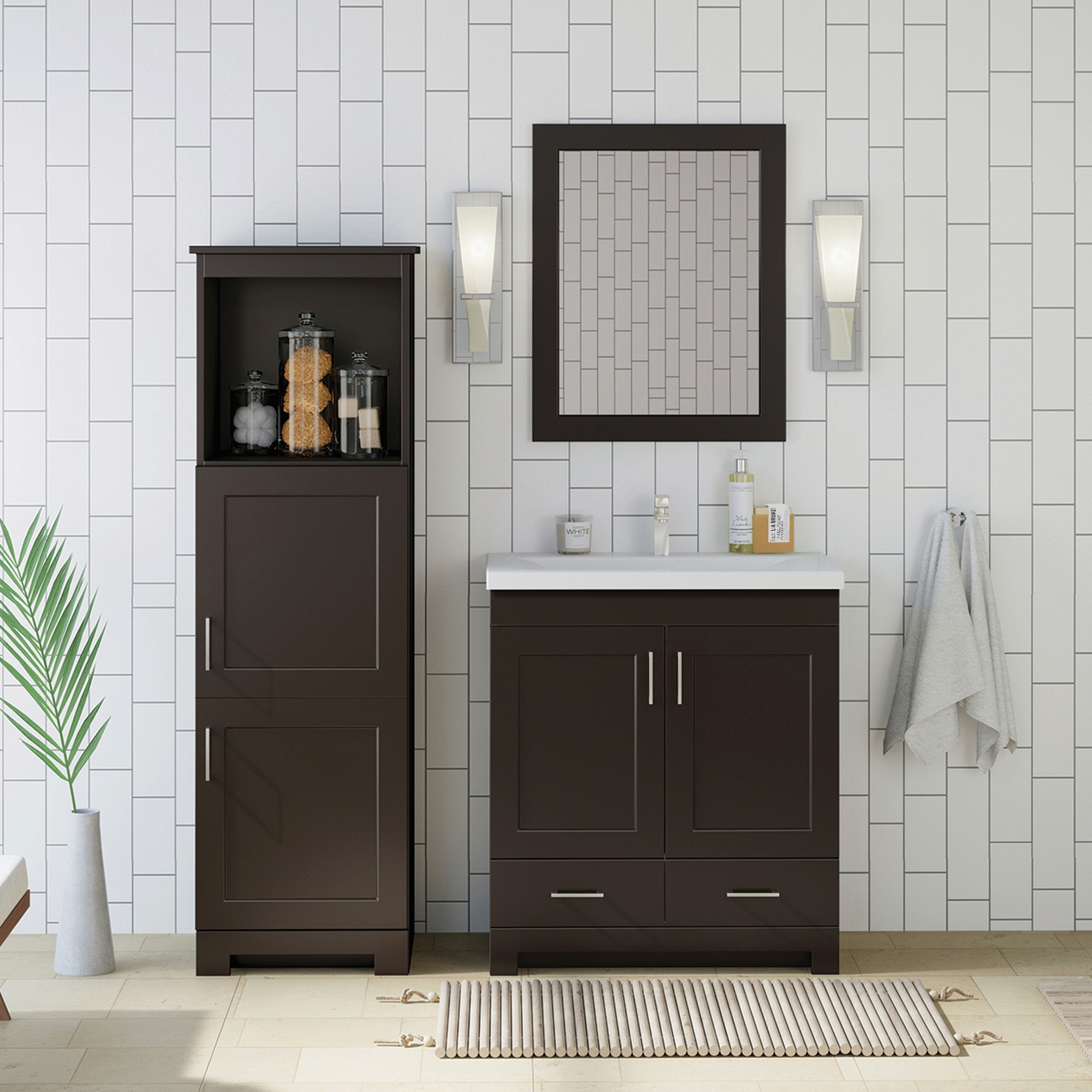 The MagickWoods Staverton collection offers a space-saving design which is ideal for smaller sized bath and powder rooms. Staverton is available in 3 beautiful and popular finishes (White, Espresso Bean and Steel Gray) to coordinate with multiple decors. Each finish is complimented with contemporary cabinet handles in a brushed nickel finish. Each 24-inch wide vanity features 2 doors and 1 drawer, and 30-inch wide and 36-inch wide vanities feature 2 doors and 2 drawers to your keep toiletries tidy. Staverton’s soft-closing doors and drawers eliminate slamming, creating quiet peaceful mornings. The simple-designed Staverton mirror hangs vertically or horizontally and is a perfect addition to any room in your home. Each Staverton vanity base includes a white ceramic vanity top with integrated rectangular bowl, drilled for a single-hole faucet (faucets are sold separately). Complete the look: the Staverton linen cabinet offers concealed storage, plus an open shelf to hold linens, baskets and favorite toiletries. Staverton vanities, mirrors and linen cabinets are conveniently pre-assembled and easy to install.