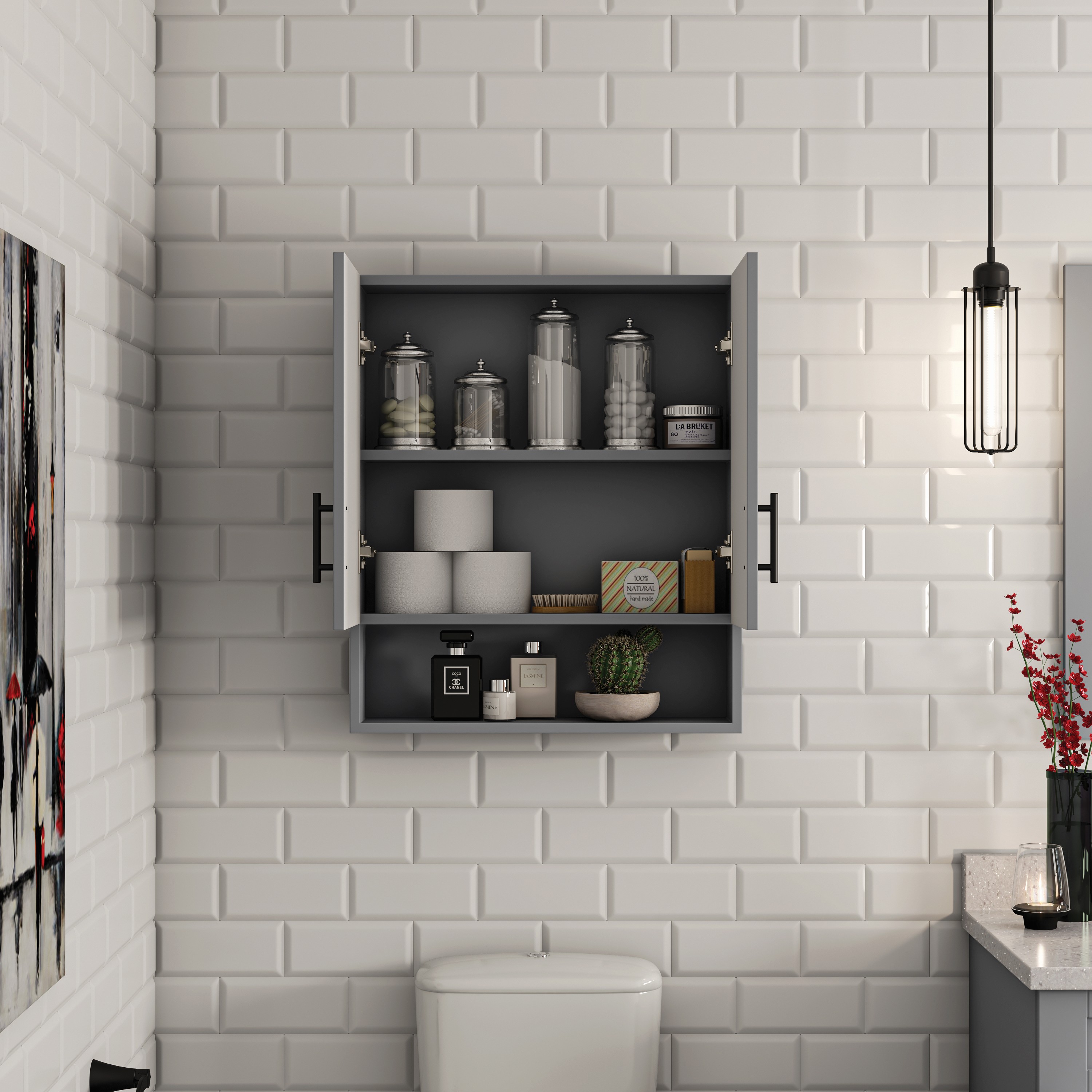 Transform your bathroom with the elegant Brighton Wall cabinet, featuring double doors. It offers a durable gray exterior with a bright white interior, plus one fixed shelf and three adjustable shelves that provide ample storage for your essentials.